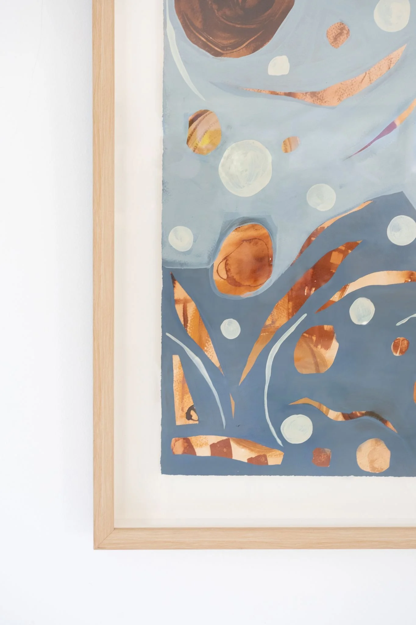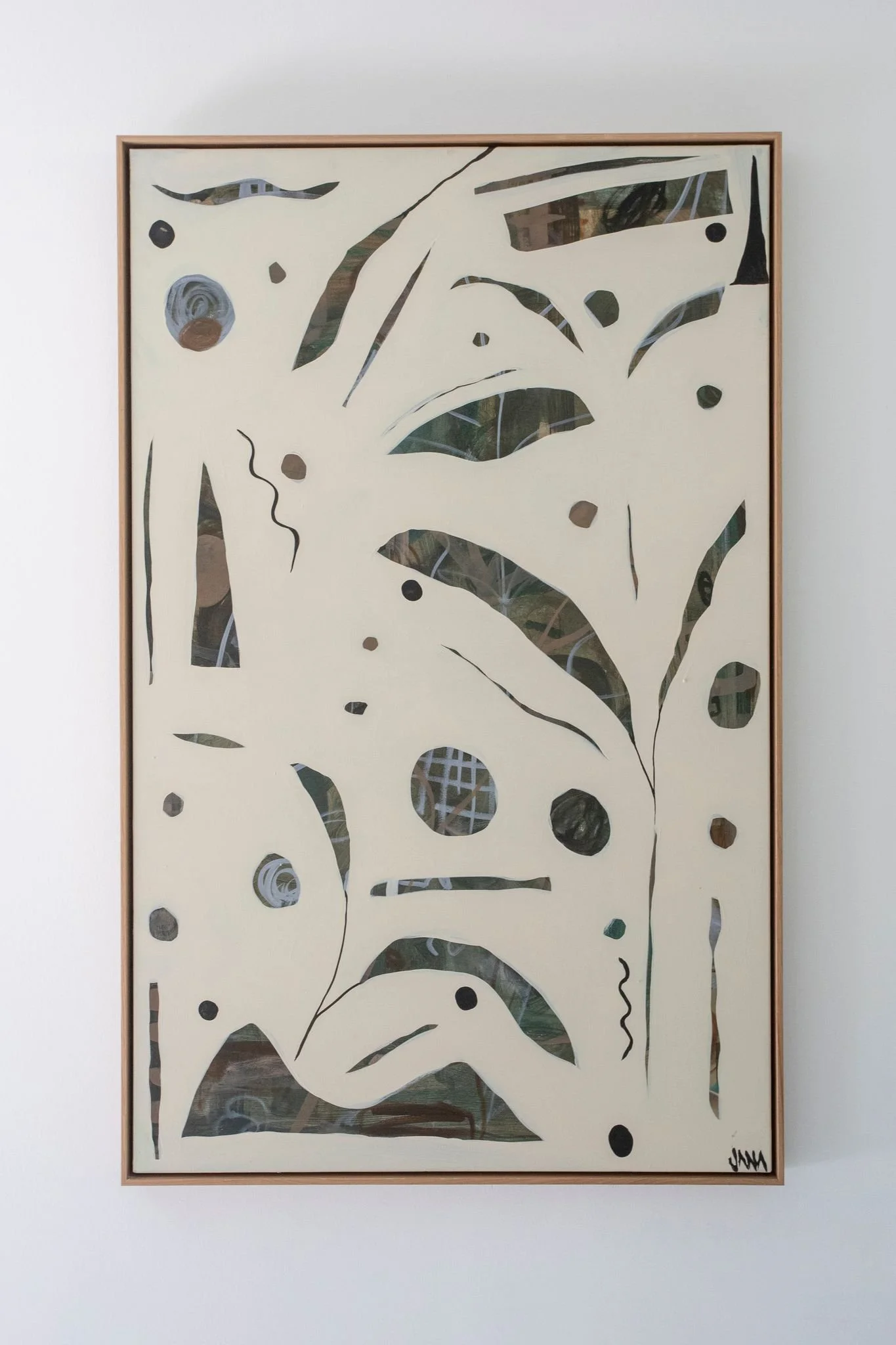“ CAPITOLA ” | ROUGHLY 25 x 32” INK, ACRYLIC ON PAPER—CUT + COLLAGED., FLOATING + FRAMED IN A MATTE WHITE FRAME | AVAILABLE VIA STELLERS ART GALLERY/MISSY RILEY’S ART + PIECES