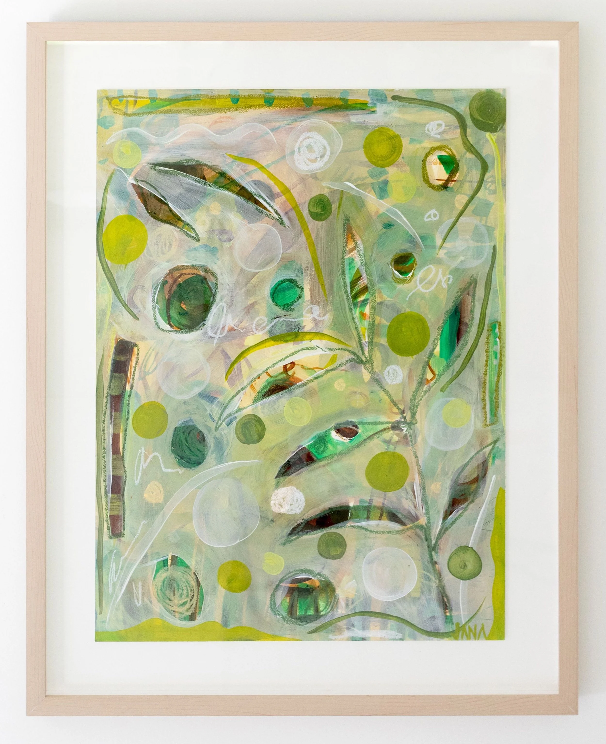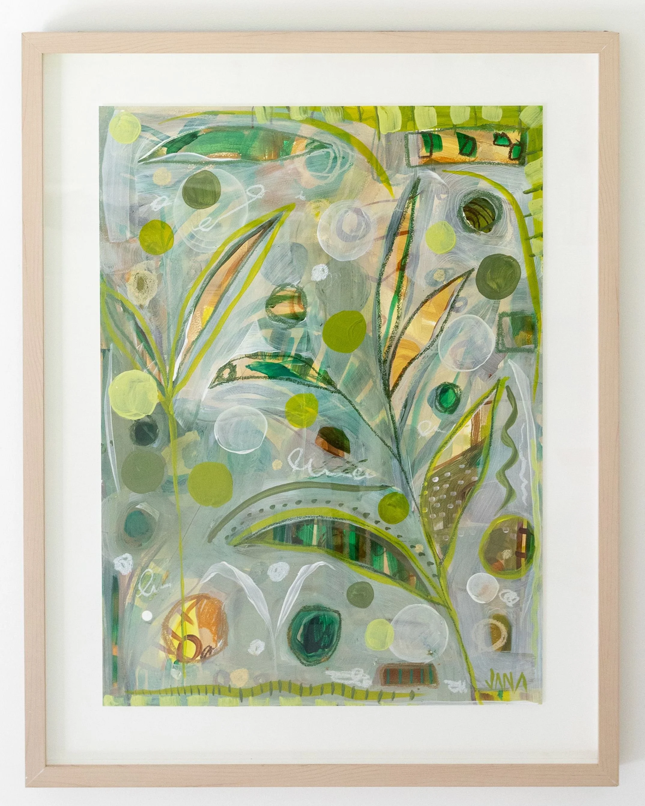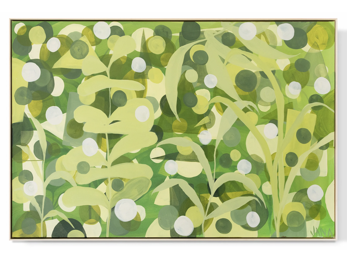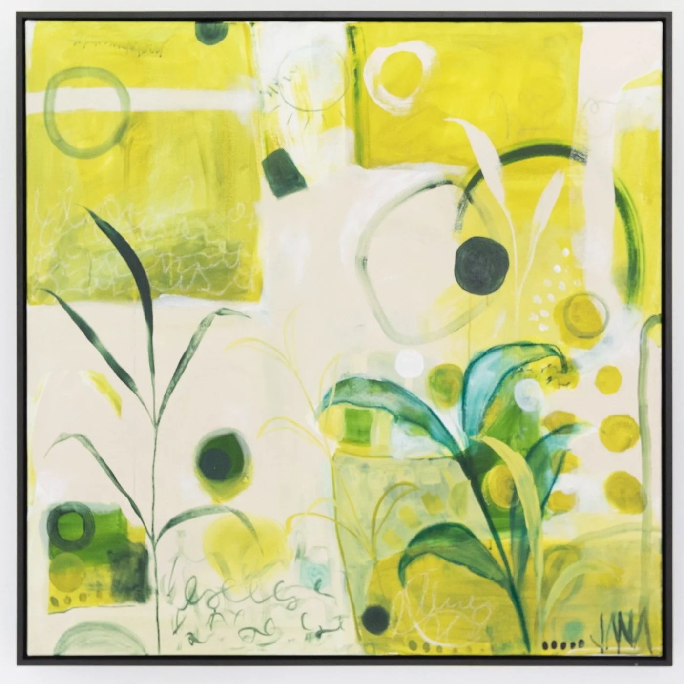 “GREEN THUMB SUMMER” | 40 x 40” + FRAMED | ACRYLIC, INK, + CHARCOAL ON CANVAS | AVAILABLE VIA ACQUISITIONS IN DALLAS, TX